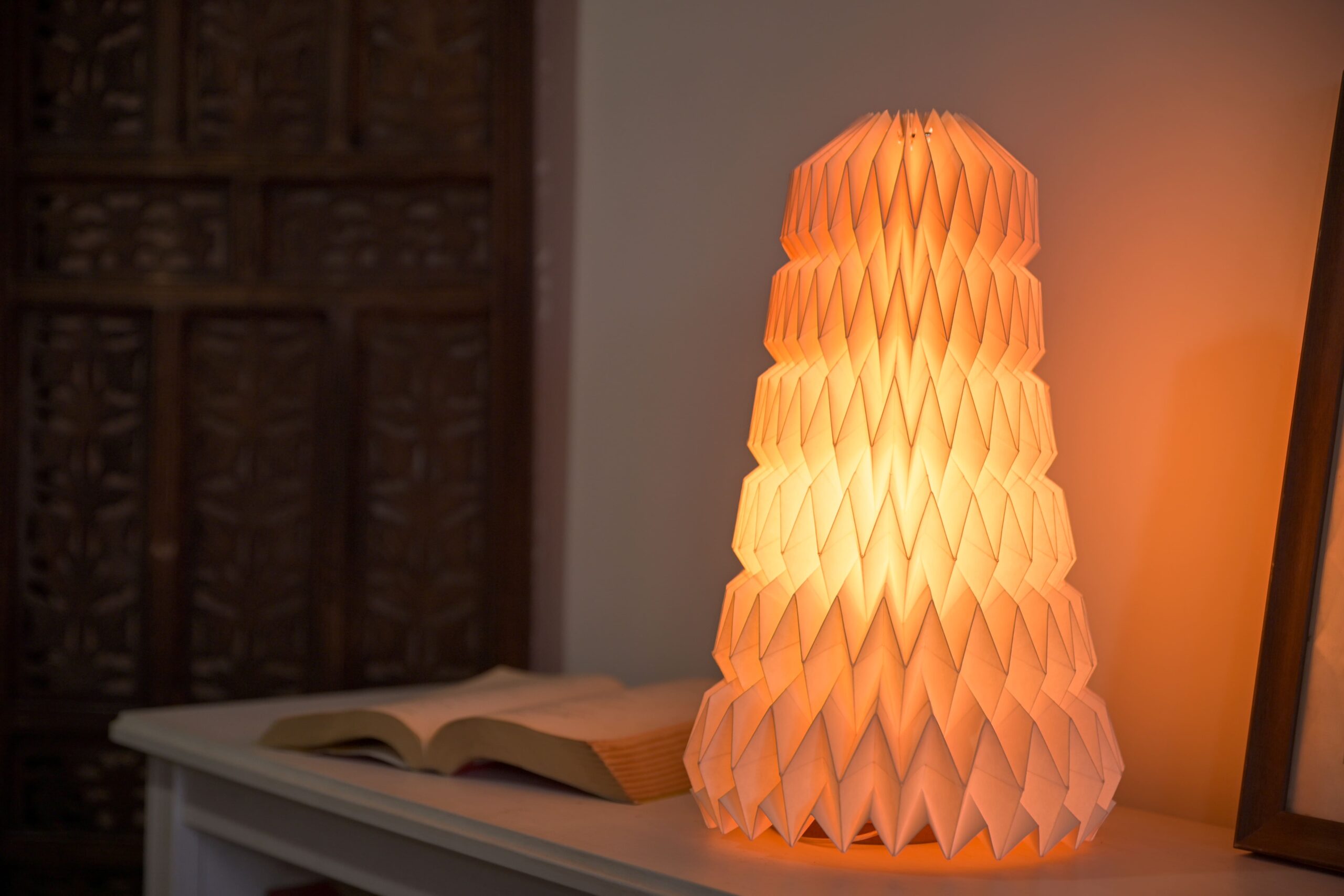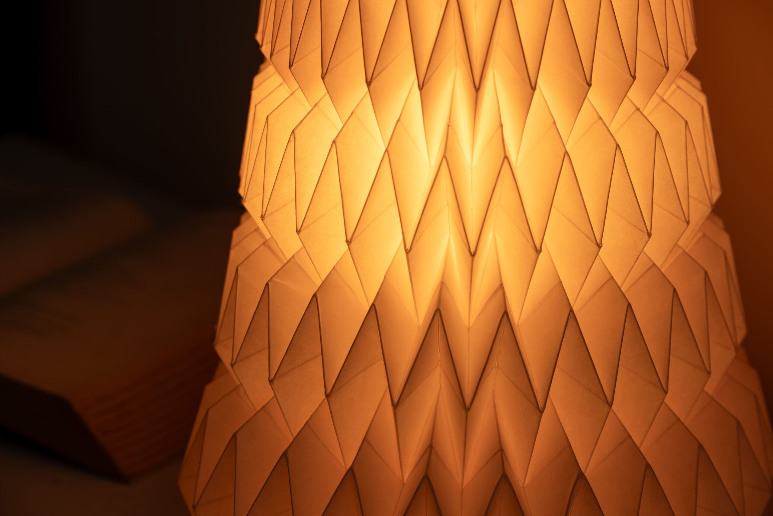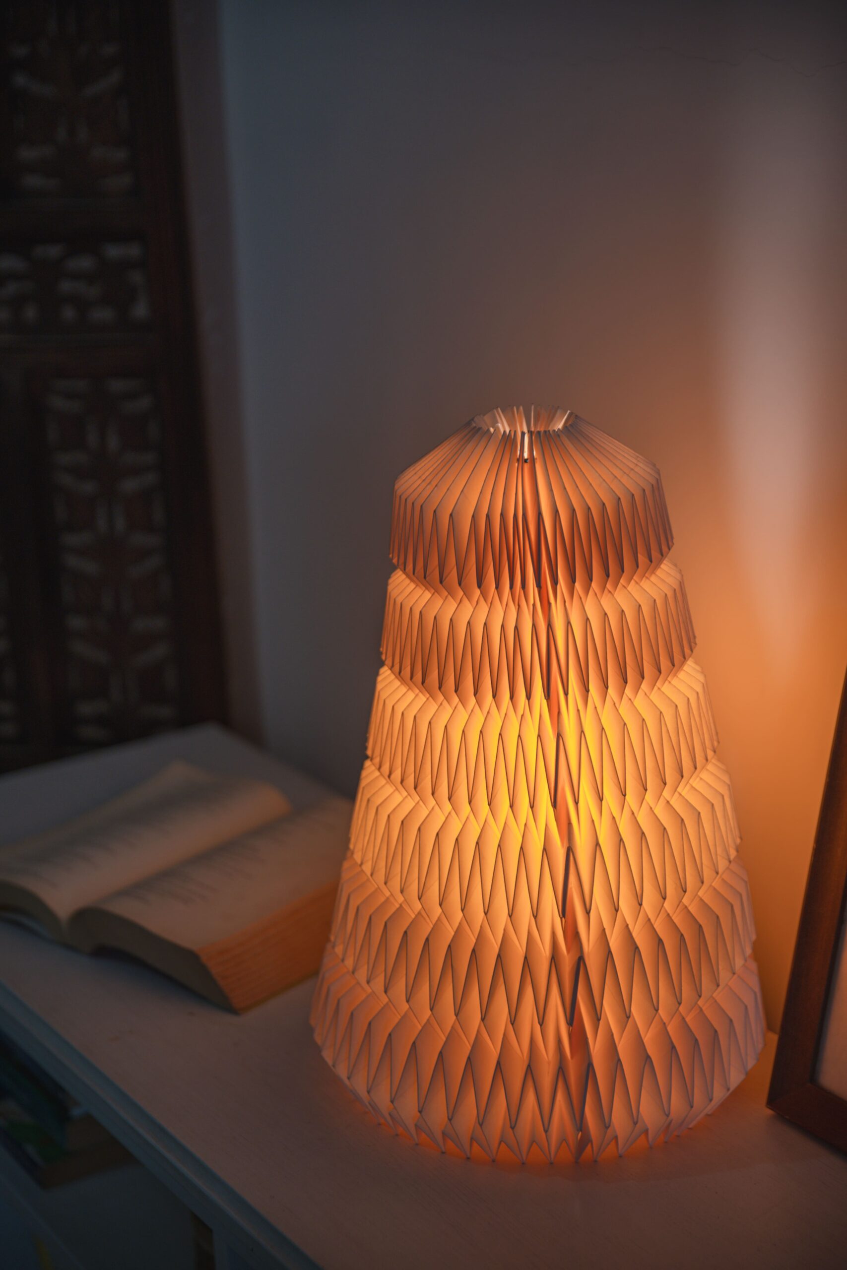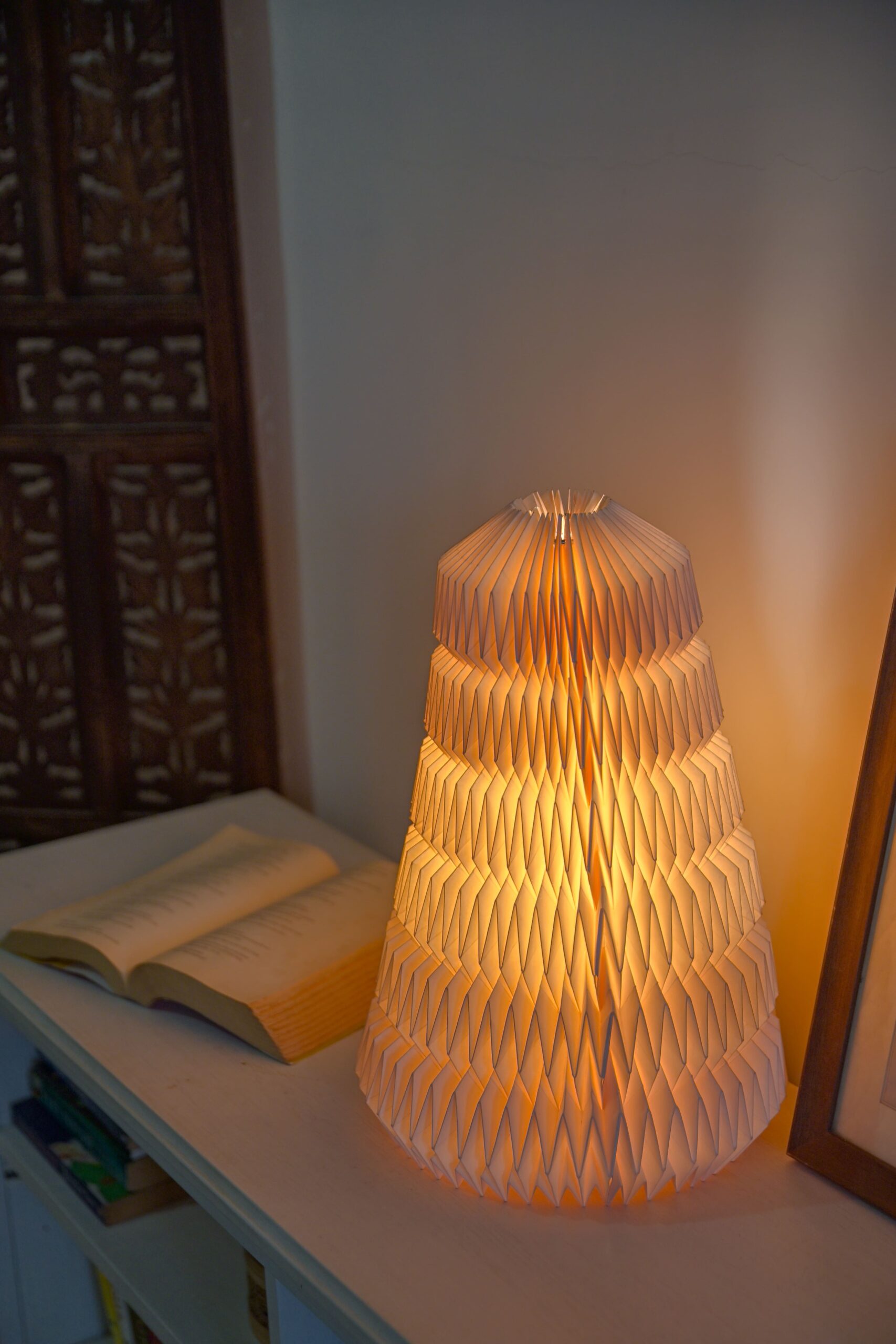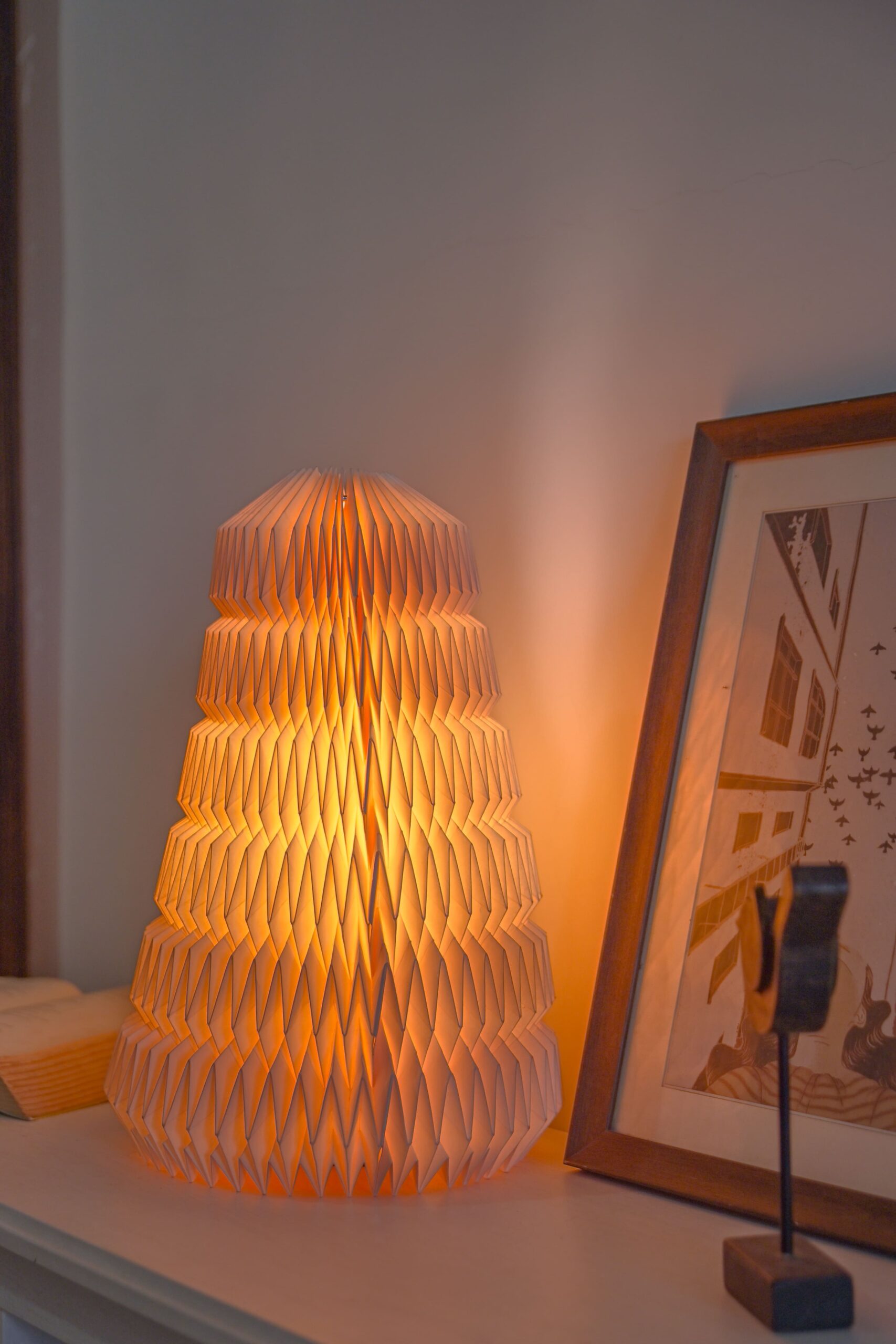 The Aurora Spire is a statement handmade lamp designed with tiered zigzag folds that echo architectural beauty. Crafted from eco-friendly handmade paper, this tall lamp creates a soft, ambient glow, making it perfect for living rooms, dining corners, or statement entryways. Inspired by origami folds, each piece is a celebration of artistry and light.